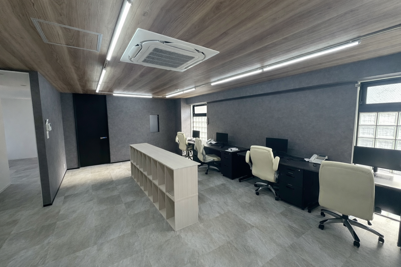 コンクリート躯体を活かした空間構成とし、シンプルで無駄のない内装に仕上げることで、落ち着きと機能性を兼ね備えた事務所空間を実現しました。
